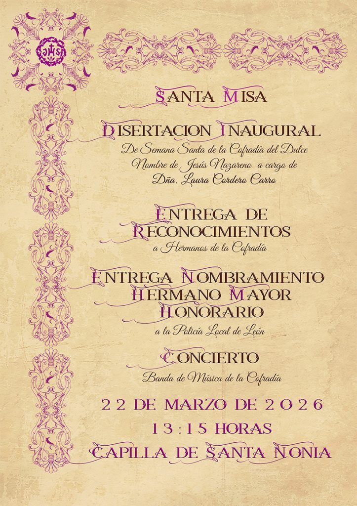 Meses antes, funda la Compañía del Dulce Nombre de Jesús Nazareno, «con objeto de servir a Dios Nuestro Señor y a honra y gloria del Santísimo Nombre de Jesús Nazareno«, su capilla en el Convento de Santo Domingo el Real, de la capital leonesa, adquiriéndola en propiedad en 1615. En los antiguos estatutos se recogía fielmente la compostura e indumentaria que debían llevar los cofrades: absoluto silencio y respeto, túnica negra sencilla y con capillo, es decir, cubiertos durante todo el trayecto de la Procesión. De su contenido podemos deducir que la Cofradía ya venía existiendo con anterioridad, si bien éste es el primer documento oficial y escrito con el que contamos en la actualidad.