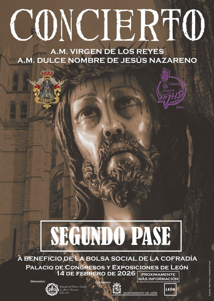 Desde la Cofradía del Dulce Nombre de Jesús Nazareno anunciamos la programación de un segundo pase del concierto conjunto entre la Agrupación Musical Virgen de los Reyes, de Sevilla, y la Agrupación Musical de nuestra Cofradía, tras agotarse las entradas del primero en tiempo récord y bajo la gran demanda del público.Ambas formaciones, referentes en el ámbito musical cofrade, actuarán en el Palacio de Exposiciones y Congresos de León el 14 de febrero de 2026, sumando ahora un nuevo pase cuyos detalles serán anunciados en los próximos días