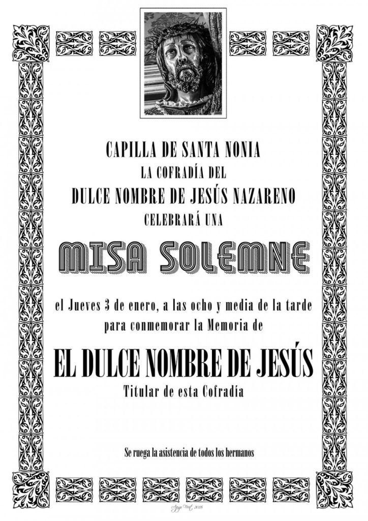 La Cofradía del Dulce Nombre de Jesús Nazareno celebra este próximo jueves día 3 de enero la Festividad del Dulce Nombre de Jesús, nuestro Sagrado Titular, con una Misa Solemne en la Capilla de Santa Nonia a las 20:30 horas.