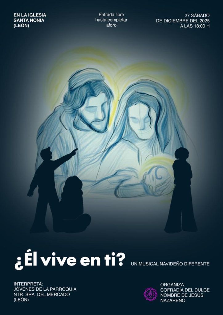 La Cofradía del Dulce Nombre de Jesús Nazareno organiza el próximo sábado 27 de diciembre, a las 18:00 horas, la representación de la obra “¿Él vive en ti?”, un musical navideño diferente que se interpretará en la Capilla de Santa Nonia. El musical será interpretado por los jóvenes de la Parroquia del Mercado, que ofrecerán una propuesta original y cercana, cargada de mensaje, música y emoción, invitando al público a reflexionar sobre el verdadero sentido de la Navidad desde una mirada joven y actual. La entrada será libre hasta completar aforo. Esta actividad se enmarca dentro del amplio programa de actos y celebraciones que la Cofradía del Dulce Nombre de Jesús Nazareno ha preparado con motivo de las fiestas de Navidad, con el objetivo de acercar la fe, la cultura y la tradición a todos los leoneses y visitantes.
