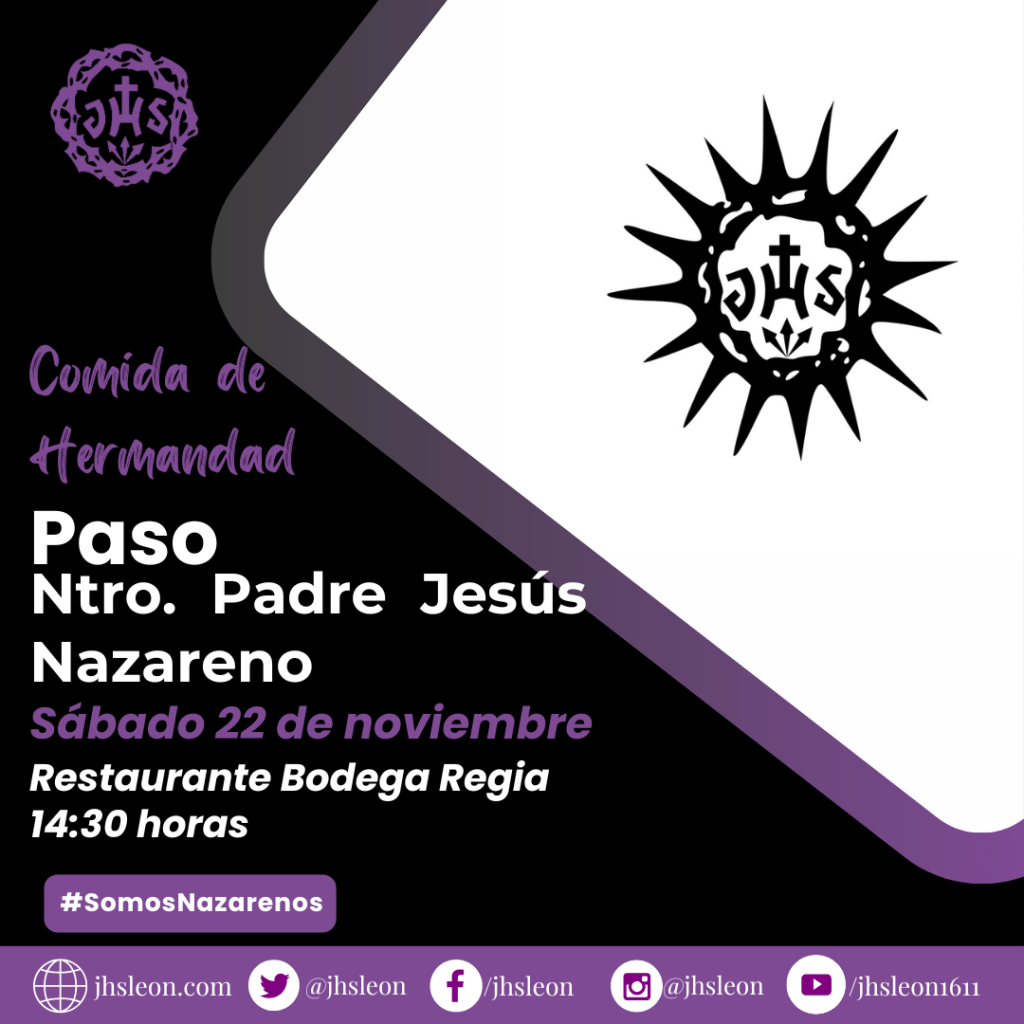 El Paso de Nuestro Padre Jesús Nazareno convoca a sus braceros y banderas a la tradicional comida de hermandad el próximo día 22 de noviembre, sábado, que se celebrará a partir de las 14:30 horas en el Restaurante Bodega Regia (C/Regidores 9) Para una mejor organización, se ruega confirmación de asistencia antes del día 19 de noviembre en el correo electrónico: nazareno@jhsleon.com